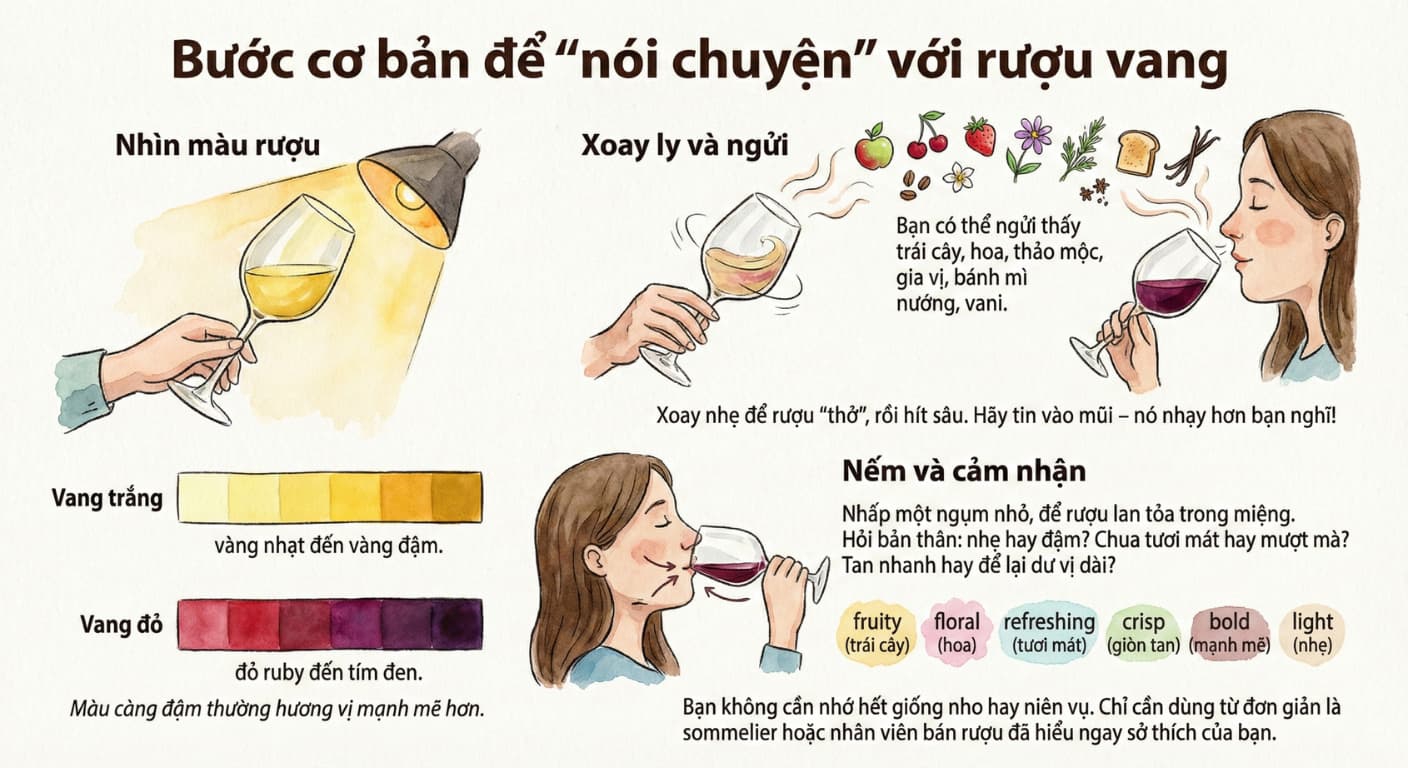 Bạn không cần nhớ hết giống nho hay niên vụ. Chỉ cần dùng từ đơn giản như: fruity (trái cây), floral (hoa), refreshing (tươi mát), crisp (giòn tan), bold (mạnh mẽ), light (nhẹ) là sommelier hoặc nhân viên bán rượu đã hiểu ngay sở thích của bạn.