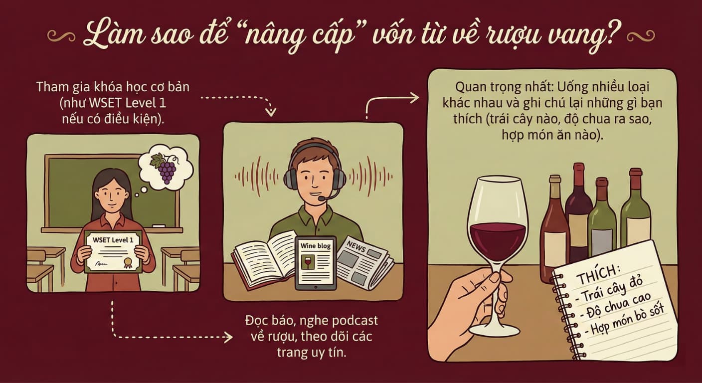 - Tham gia khóa học cơ bản (như WSET Level 1 nếu có điều kiện).