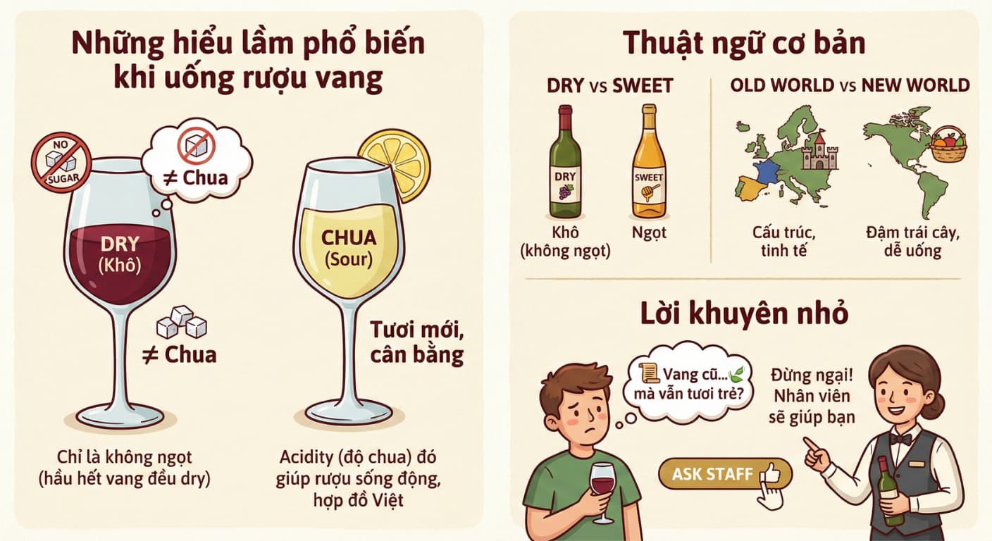 - Dry (khô) ≠ chua: “Dry” chỉ là không ngọt (hầu hết rượu vang đều dry). Nếu bạn thích ngọt nhẹ, cứ nói thẳng – rất dễ tìm.
